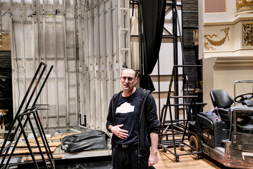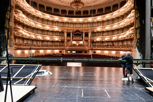 Jens Kühn bewegt sich gelassen durch die Bühnendekorationen der Mozart-Vorstellung vom Vorabend. Bereits nach der Aufführung und am frühen Morgen hatten sie die Bühne umgebaut: von der „Zauberflöte“ zu „Kabanová“. Ganz am Rande stehen schon die meterlangen rollbaren Transportkisten mit Bühnenteilen für den Abend. Wenn die Probe gegen 13 Uhr beendet sein wird, geht die Bühnentruppe an den zweiten Umbau des Tages. Sie bauen dann „Kabanová“ ab und „Romeo und Julia“ auf. Die Arbeit ist trotz Fahrstühlen und Bühnentechnik körperlich mitunter hart. „Irgendwann im Laufe des Auf- wie des Abbaus muss jedes Bühnenteil auch mal mit Muskelkraft bewegt werden“, weiß Kühn aus jahrzehntelanger Erfahrung. Als Dekorateur kümmert sich Kühn auf der Bühne insbesondere um Bodenbeläge, Vorhänge, Möbel, hilft aber selbstverständlich auch den Bühnentechnikern mit den größeren Bühnenteilen. Immer mal sei er auch sichtbar in die Vorstellung eingebunden: Er würde dann kostümiert auf offener Bühne arbeiten. Und die Zuschauer nähmen die Veränderungen durchaus wahr. Kühn erzählt von einem Umbau während eines Orchesterzwischenspiels in Richard Wagners „Meistersinger“: Wenn sich der Vorhang nach nur 70 Sekunden wieder öffnet und die Bühne sich komplett verändert hat, gibt es oft spontanen Applaus. Offensichtlich sind auch die technischen Abläufe ein durchchoreografierter Teil jeder Inszenierung. Und: „Kein Tag ist hier wie der andere.“ Kühn freut das.