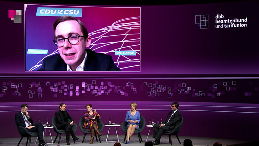 Philipp Amthor, Mitglied des Deutschen Bundestages, Katja Dörner, Oberbürgermeisterin der Bundesstadt Bonn, Christian Dürr, Vorsitzender der FDP-Bundestagsfraktion, Dr. Markus Optendrenk, Minister der Finanzen von NRW, Philippa Sigl-Glöckner, Direktorin und Geschäftsführerin vom Dezernat Zukunft, Moderation: Anke Plättner