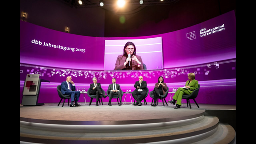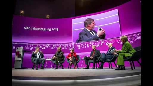 Volker Geyer, stellvertretender dbb Bundesvorsitzender und Fachvorstand Tarifpolitik, Christian Haase, MdB, CDU/CSU-Fraktion, Konstantin Kuhle, MdB, FDP-Fraktion, Ingo Schäfer, MdB, SPD-Fraktion, Dr. Irene Mihalic, MdB, Fraktion Bündnis 90/ Die Grünen, Anke Plättner Moderation