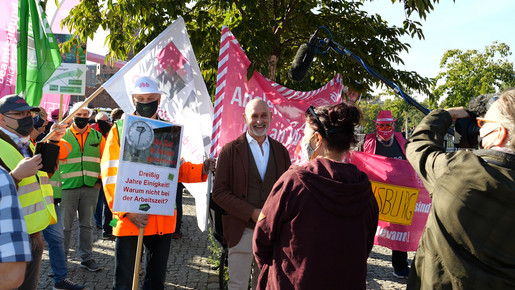 „Wir können uns 30 Jahre nach der Wiedervereinigung nicht mehr damit abfinden,  dass Beschäftigte im kommunalen öffentlichen Dienst immer noch unterschiedlich lange arbeiten müssen – 40 Wochenstunden im Osten und 39 im Westen“, betonte dbb Fachvorstand Tarifpolitik Volker Geyer am 3. Oktober 2020 vor der Oberbaumbrücke in Berlin. „Die aktuelle Einkommensrunde in Bund und Kommunen ist daher ein guter Anlass, mit dieser Unsitte zu brechen.“ Neben dem geschichtsträchtigen Ort an der ehemaligen innerdeutschen Grenze protestierten Beschäftigte des öffentlichen Dienstes auch in weiteren Städten wie Rostock, Halle/Saale, Dresden und Gotha.