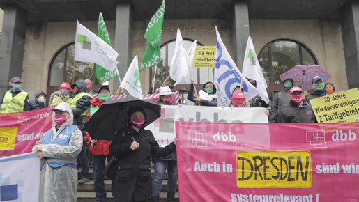 In Dresden haben Beschäftigte des öffentlichen Dienstes am 14. Oktober 2020 mit einer Protestaktion die Angleichung der Arbeitszeit Ost an West für Kommunalbeschäftigte angemahnt.